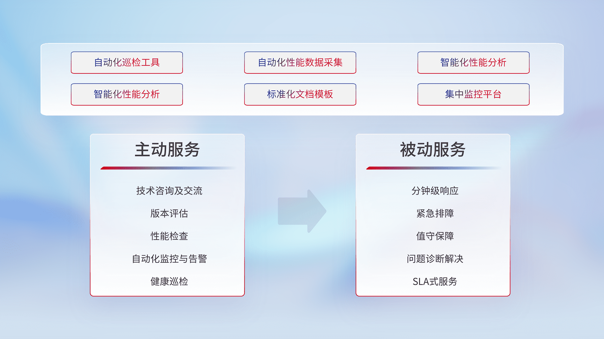 智能化工具和标准化文档,,保障服务质量,,,,提供主动服务(包含技术咨询、、、、版本评估、、性能检查、、、、自动化监控与告警、、健康巡检)和被动服务包含(分钟级响应、、、、紧急排障、、值守保障、、、、问题诊断解决、、SLA服务)。。。